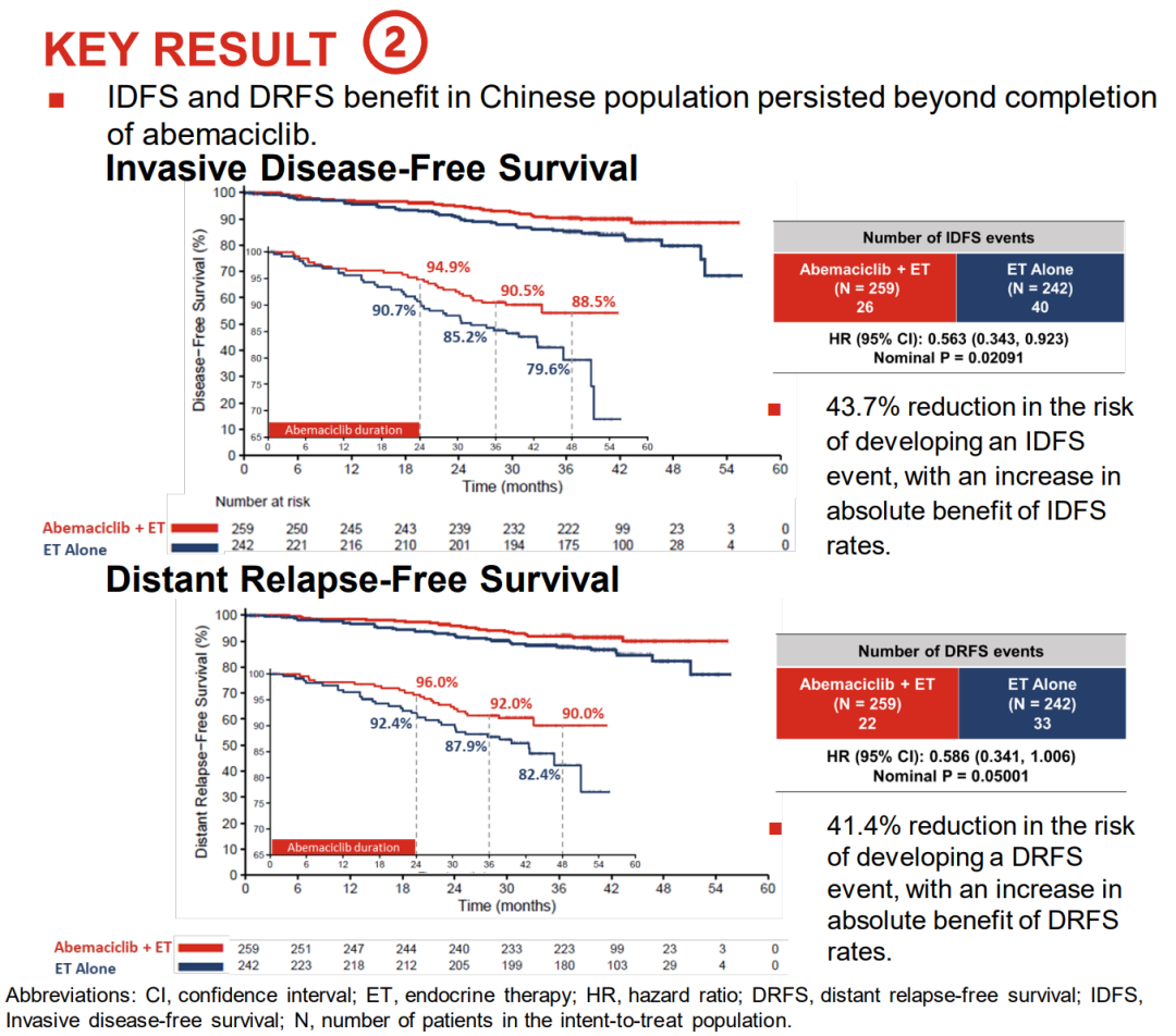在疗效方面,本次ESMO BC进一步揭示了Monarch E研究中国人群的数据结果2。对于早期高危HR+/HER2-乳腺癌中国人群,阿贝西利联合内分泌治疗组较单纯内分泌治疗组取得了无浸润性疾病生存期(IDFS,HR=0.563,95%CI:0.343~0.923)和无远处复发生存期(DRFS,HR=0.586,95%CI:0.341~1.006)的持续获益,而且随着随访时间的延长,获益愈加明显。