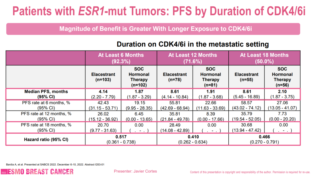 图3:ESR1突变人群既往CDK4/6抑制剂治疗时间与mPFS的关系