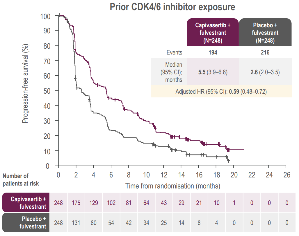 图5:CDK4/6抑制剂经治患者使用capivasertib+氟维司群较氟维司的mPFS曲线