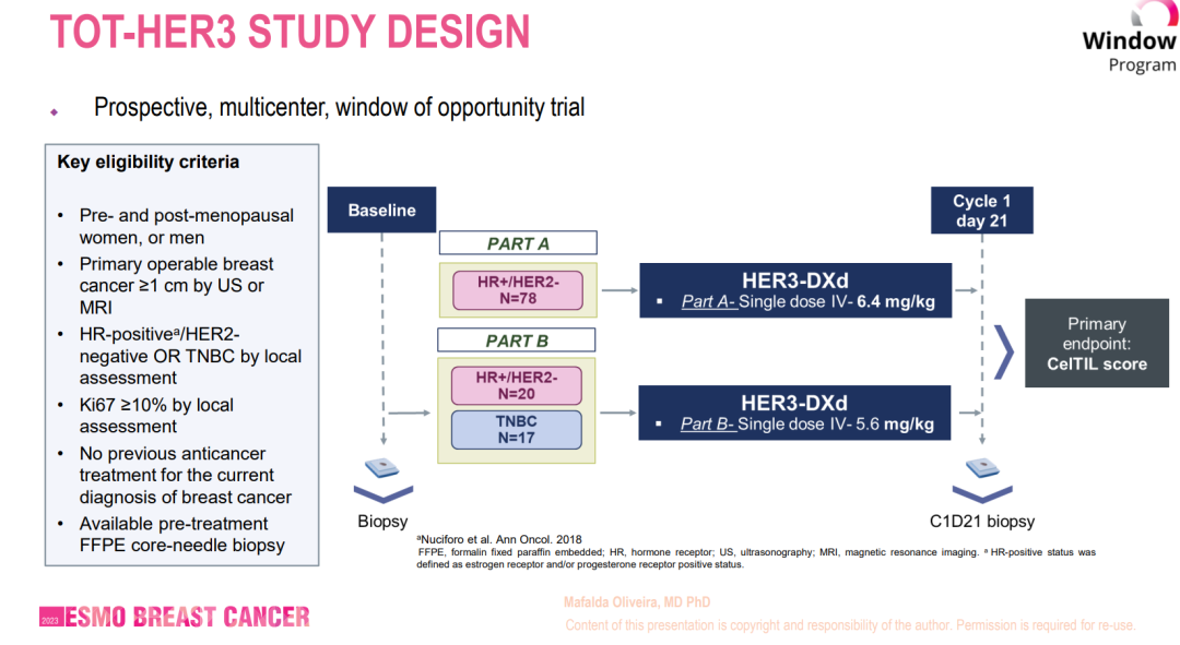本次ESMO BC会议报道的SOLTI-TOT-HER3研究是一项机会窗试验,即在诊断和标准治疗中的窗口期探讨生物标志物与靶向治疗药物疗效的预测价值,分为A、B两个部分。