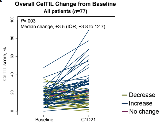 A部分结果于2023年刊发于《Annals of Oncology》,针对77例未经治疗的HR+/HER2-早期乳腺癌患者,根据基线HER3 mRNA表达水平分为4个队列,并予以6.4mg/kg HER3-DXd,主要观察终点是肿瘤细胞及肿瘤浸润淋巴细胞(CelTIL)指数,CelTIL指数=-0.8×肿瘤细胞密度(%)+1.3×TILs(%),是肿瘤细胞结构和肿瘤浸润淋巴细胞的反应替代指标。结果显示CelTIL指数有显著提升(从-3.8提升至12.7,P=0.003),ORR为45%。另外,部分PD-1相关的免疫治疗基因高表达也为HER3-DXd疗效提供了预测价值,提示免疫检查点抑制剂与HER3-DXd具有协同作用,与临床前研究结果一致,为后续临床应用带来更多启发11