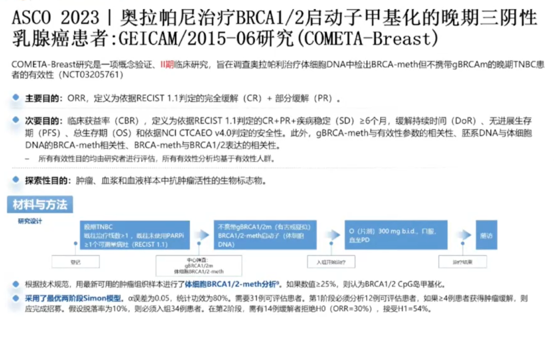 COMETA-Breast研究结果显示,奥拉帕利在携带BRCA1/2-meth的晚期TNBC患者中未表现出具有临床和统计学意义的抗肿瘤活性;这是一项概念验证研究,应谨慎解读结果。还需开展进一步的研究来证实这些发现,并更好地了解奥拉帕利在该人群中的潜在有效性。