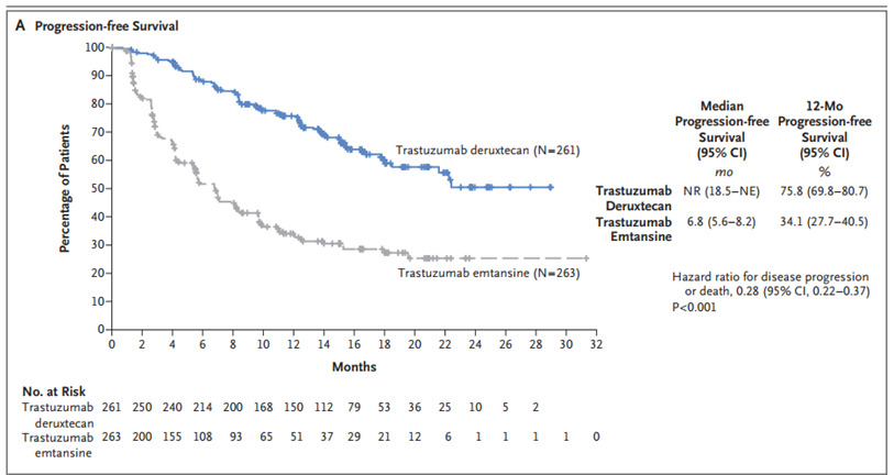 随后,乳腺癌领域又陆陆续续有ADC药物问世,如德曲妥珠单抗(T-DXd;DS-8201)、戈沙妥珠单抗(SG)等。T-DXd的作用靶点也是HER2,但其与T-DM1的连接子和药物载荷不同,DESTINY-Breast01(DB-01)研究、DESTINY-Breast02(DB-02)研究结果提示,对于HER2+晚期乳腺癌患者,T-DXd显示出了非常好的治疗疗效。DESTINY-Breast03(DB-03)研究将T-DXd与T-DM1进行了头对头比较,结果显示,T-DXd组的中位无进展生存期(PFS)、中位总生存期(OS)和客观缓解率(ORR)等都明显好于T-DM1组。