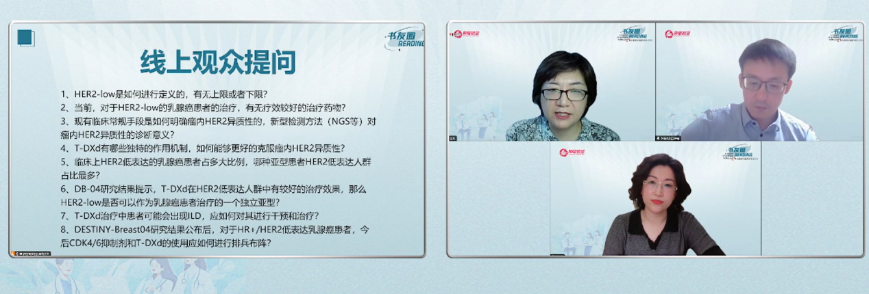 编者按:2023年8月27日(周日)19:30,《书友圈》第一期开播,中国医学科学院肿瘤医院袁芃教授(主持人)、复旦大学附属肿瘤医院李俊杰教授(讲者)、中国医科大学附属第一医院徐莹莹教授(讲者)共同做客《书友圈》,就当前HER2-low的机遇与挑战、演变及未来发展趋势进行了介绍,讲课结束后三位专家就直播过程中的读者问题进行了解答,本文特进行回顾。