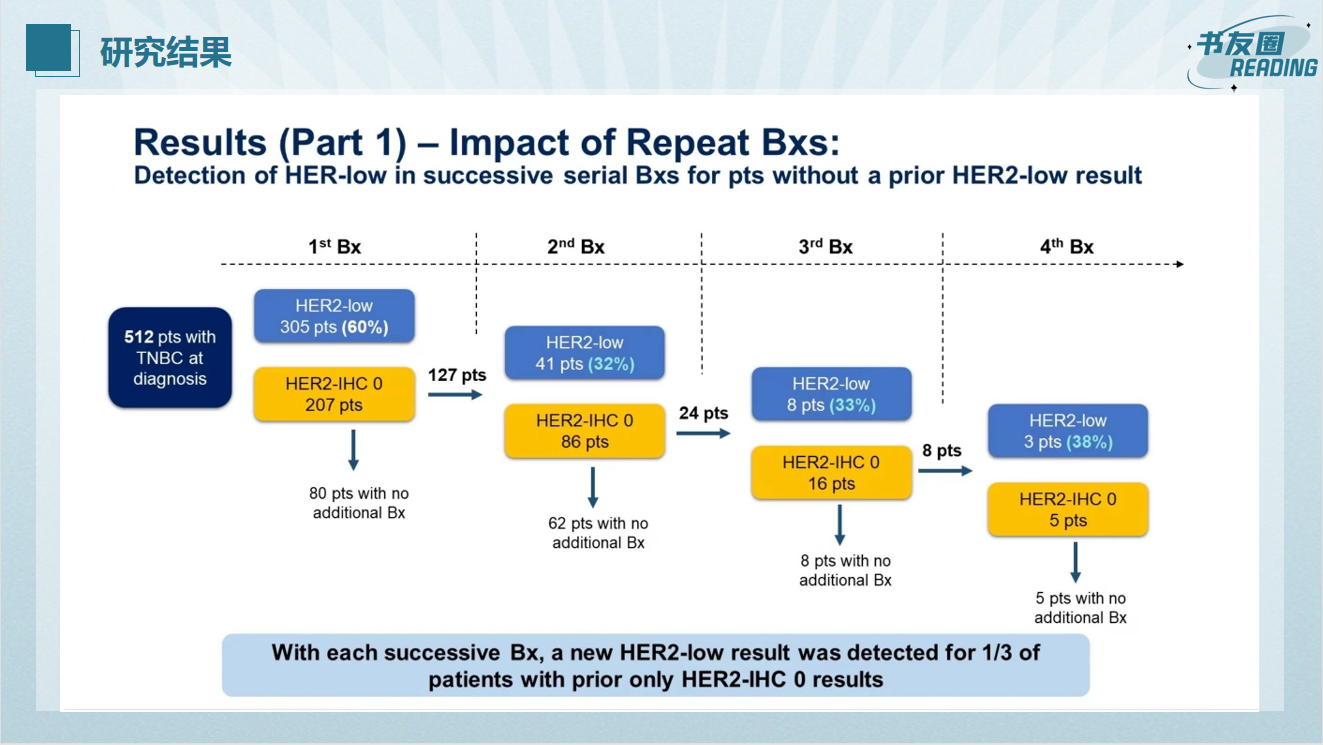 在讲课中,李俊杰教授提到,经FDA批准德曲妥珠单抗(T-DXd)目前可用于治疗HER2-low乳腺癌患者,但不适用于HER2-0转移性TNBC和激素受体阳性乳腺癌。因此,识别HER2-low状态具有重要的临床意义。既往的研究表明,TNBC中的HER2-low状态是动态的,但进行连续活检(Bx)的次数与HER2-low结果之间的相关性尚不清楚。该研究评估了连续活检次数与TNBC患者HER2-low概率的相关性及TNBC患者整个病程中HER2状态的动态变化。