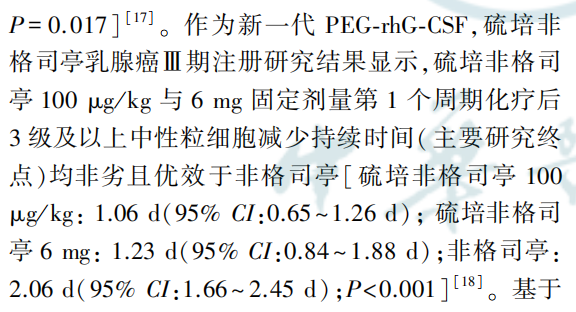 对于长效制剂PEG-rhG-GSF,2023版专家共识指出,硫培非格司亭在Ⅲ期临床研究中对比非格司亭得到了优效结果,显示出比短效G-CSF更好的对中性粒细胞减少的控制效果。