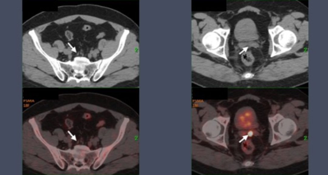 患者为43岁中年男性,初诊PSA 54 ng/mL,穿刺病理为前列腺腺泡腺癌(Gleason 5+5)。MRI显示侵犯精囊、直肠,盆腔及腹膜后多发淋巴结转移。PSMA PET/CT显示前列腺弥漫性PSMA高表达,骶前、腹膜后及两侧髂血管淋巴结转移,双侧髂骨局灶性PSMA高表达。