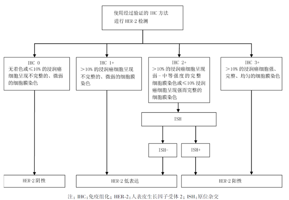 在最新的《人表皮生长因子受体2低表达乳腺癌临床诊疗共识(2022版)》[2]中,HER2低表达被定义为免疫组化(immunohistochemistry,IHC)1+,或IHC 2+且原位杂交(in situ hybridization,ISH)HER2基因无扩增(IHC 1+或IHC 2+/ISH-,如图1所示)。这类患者占乳腺癌全体的45%~55%,在目前的临床实际中,仍有部分患者被称作为HR+/HER2-或三阴性乳腺癌[3]。