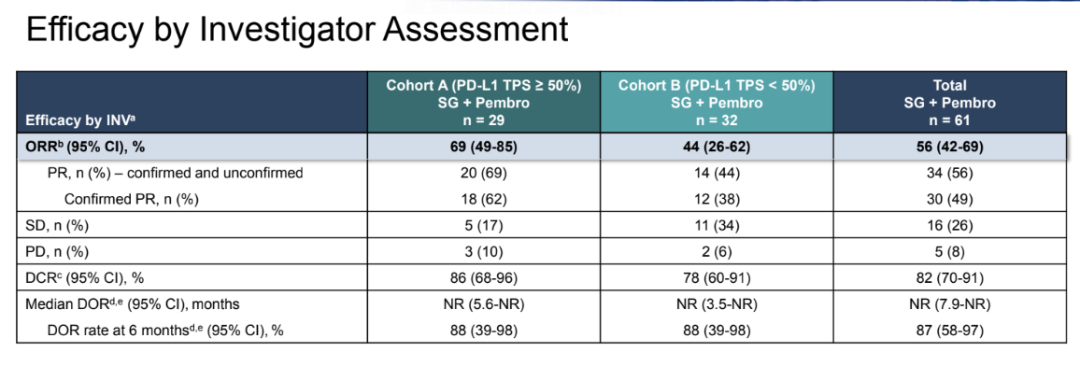 刚刚结束的2023 WCLC会议公布了EVOKE-02研究A、B队列的初步结果,队列A(PD-L1 TPS≥50%)和队列B(PD-L1 TPS<50%)共90例患者入组并接受治疗。在疗效可评估患者中(n=61),队列A的客观缓解率(ORR)为69%,疾病控制率(DCR)为86%,队列B的ORR为44%,DCR为78%。两个队列合并数据分析显示,患者的ORR为56%,DCR为82%。最常见的任何级别的AE是腹泻(54%)、贫血(48%)和乏力(38%)。SG的已知关键安全事件并没有随着帕博利珠单抗的加入而增加,免疫相关不良事件与帕博利珠单抗的已知安全性一致,因不良事件导致的停药率为18%,观察到1例与治疗相关的死亡是由于败血症。此次结果表明,SG+帕博利珠单抗在初治转移性NSCLC患者中表现出令人鼓舞的早期疗效和可控安全性。