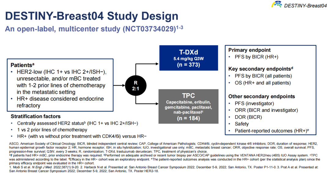 DB-04研究是一项全球多中心Ⅲ期临床试验,入组患者为治疗既往接受过1线或2线化疗的HR+或HR-、HER2低表达(HER2低表达)的不可切除和/或转移性乳腺癌(mBC)患者,随机(2:1)接受T-DXd或医生选择的化疗(TPC),主要终点是HR+患者的PFS,关键次要终点包括所有患者的PFS和OS、HR+患者的OS等。