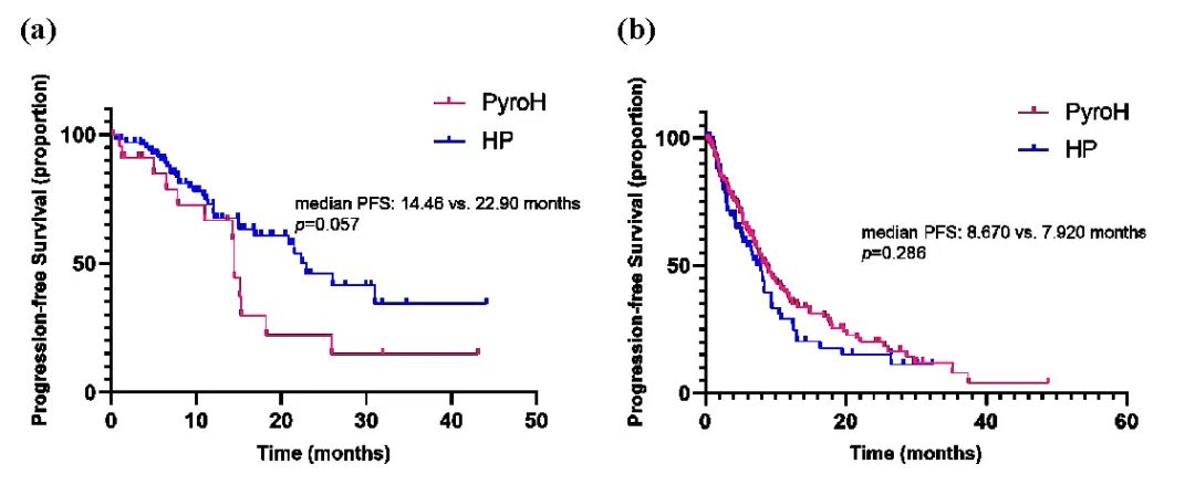 在晚期一线治疗中,HP疗效在数值上更好(中位PFS 22.90月vs 14.46月,P=0.057),而二线以上的晚期解救治疗中,PyroH和HP组之间的PFS没有显著差异(中位PFS 8.67 vs.7.92个月,P=0.286)。