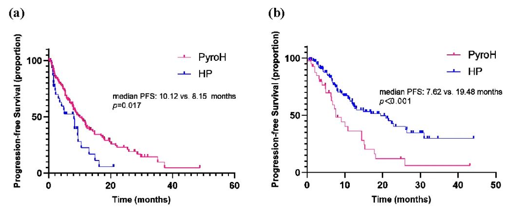 在不联合紫杉类药物治疗的患者,PyroH的PFS显著优于HP组(中位PFS:10.12与8.15个月,P=0.017)。