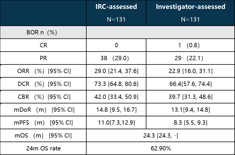 方法:既往内分泌治疗和1-2线化疗后的HR+/HER2-MBC患者,接受吡罗西尼(Birociclib)480mg Bid连续口服,直到疾病进展或不可耐受的毒性。主要终点是独立审查委员会(IRC)根据RECIST v1.1评估的客观缓解率(ORR)。其他终点包括研究者评估的ORR、反应持续时间(DoR)、无进展生存期(PFS)、总生存期(OS)和安全性等。