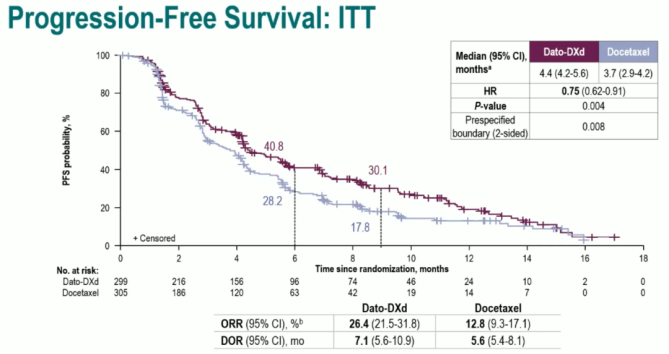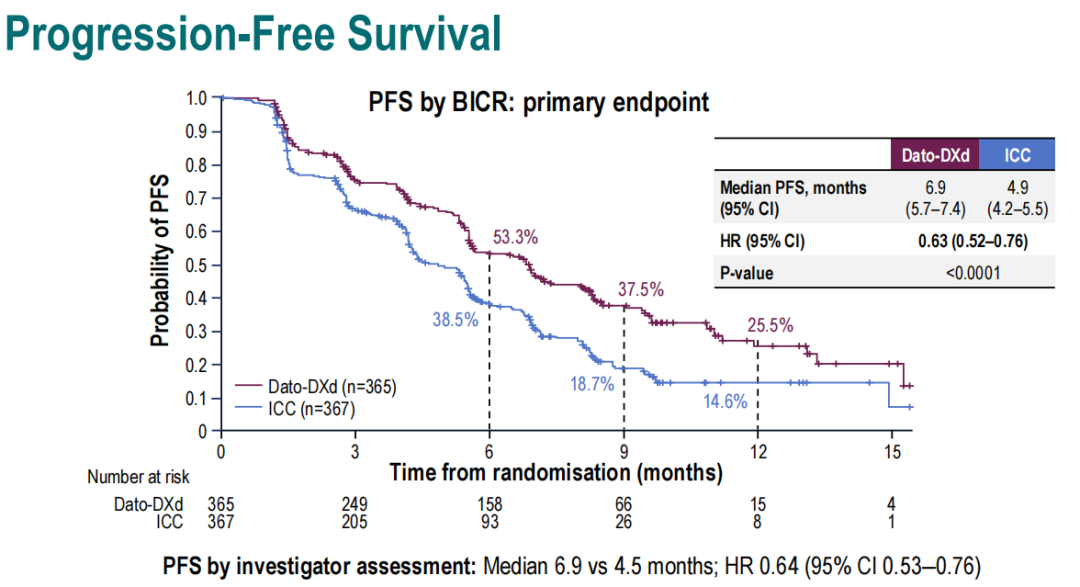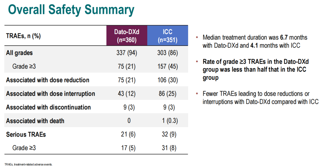 从研究公布的结果我们可以看到,相较于ICC组,DATO-DXd取得了较好的PFS数据。Dato-DXd组和ICC组患者的中位PFS分别为6.9个月和4.9个月,Dato-DXd组患者的疾病进展或死亡风险相较于ICC组显著降低37%(HR 0.63,95%CI:0.52~0.76;P<0.0001)。虽然OS数据尚未成熟,但已观察到Dato-DXd组的获益趋势(HR 0.84,95%CI:0.62~1.14),我们也期待后续OS数据结果的公布。