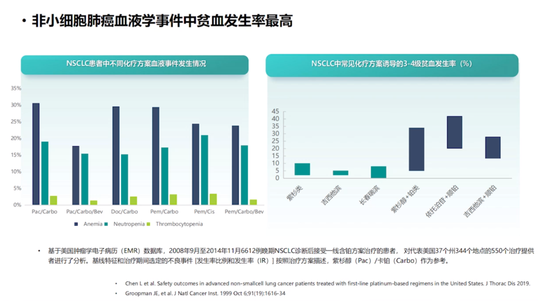在靶向、免疫高速发展的当下,化疗仍是肺癌治疗的基石手段。但化疗在治疗肿瘤的同时,也对正常增殖的细胞产生影响,从而使肿瘤患者贫血发生率提高10%~35%[3,4,5],随着化疗周期数的增加,肺癌患者贫血发生率以及严重程度也不断增加[6]。对于NSCLC患者,贫血发生率约为30%,业已成为其发生率最高的血液相关不良反应[7],尤以含铂二联化疗方案3-4度贫血发生率较高,顺铂联合依托泊苷甚至接近50%[8]