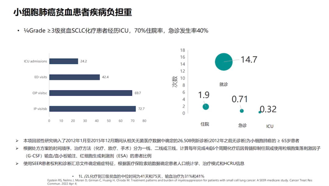 对于小细胞肺癌而言,美国一项超过26000例的回顾性分析显示老年SCLC患者贫血发生率达71.7%,由于红细胞寿命相对较长,贫血具有延迟发生的特点,一线化疗中位贫血发生时间在第41天,二线化疗则在第75天,此时患者往往在院外,极其容易忽视。肿瘤相关贫血危害严重,约有40%的患者需要输血治疗,约1/4的≥3度贫血患者会入住ICU,40%的患者赴急诊就诊,70%的患者住院,其紧急性和严重性可见一斑[9]