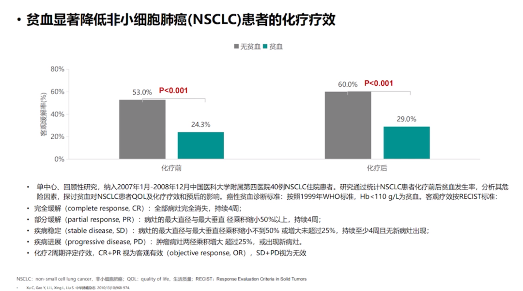 我国同样证实了基线贫血会降低患者生存获益。浙江省肿瘤医院一项回顾了近5000例患者的研究显示,晚期NSCLC患者基线贫血严重程度越高,总生存获益就越差[12]。患者化疗前、化疗后贫血都会降低化疗疗效,降低客观缓解率(ORR)[13]