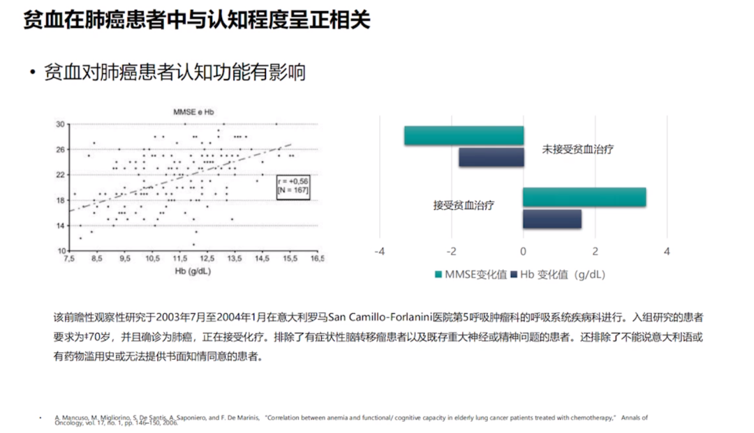 贫血不仅仅降低肺癌的治疗效果,还降低了患者的生活质量。意大利一项针对≥70岁肺癌患者的研究显示,接受贫血治疗的患者的简易精神状态检查量表(MMSE)的呈正向变化,而未接受贫血治疗的则呈负向变化,认知功能变差[14]
