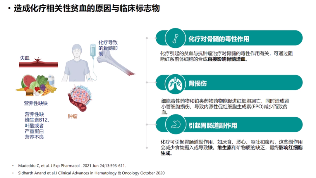肿瘤患者发生贫血的原因很多,包括失血、肿瘤进展、营养问题、化疗等。化疗可以通过作用于人体不同器官引发贫血,比如化疗的骨髓毒性直接影响骨髓造血;化疗导致的肾毒性会引起肾小管损伤致使内源性促红细胞生成素(EPO)分泌减少,从而抑制红系祖细胞分化;化疗引起的恶心、呕吐、厌食等会造成铁摄入减少,影响血红蛋白的生成和血细胞成熟[16,17]
