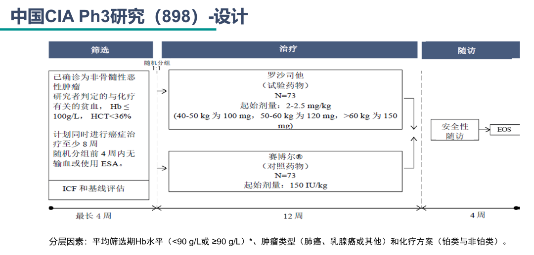 今年的ESMO年会中,上海交通大学附属胸科医院陆舜教授团队分享了一项评价罗沙司他应用于接受化疗的非髓性恶性肿瘤患者的全球、多中心、开放、阳性对照的三期临床研究(CTR20213265)[21,22]。研究计划入组146名CIA成人患者,按照肿瘤类型、是否应用含铂方案、基线Hb是否超过90g/L进行分层,并按1:1分组后予以2.0mg/kg-2.5mg/kg罗沙司他或150IU/kg rHuEPO-α,每4周1次,持续治疗12周,治疗结束后再随访4周。主要研究终点为第9-13周平均血红蛋白水平较基线的变化情况,次要研究终点包括基线到第13周血红蛋白升高≥10g/L患者比例、第5周至第13周需要红细胞输注或血红蛋白<60g/L的患者比例、第9-13周患者疲乏或贫血生活质量平均值较基线变化、安全性评估及亚组分析。