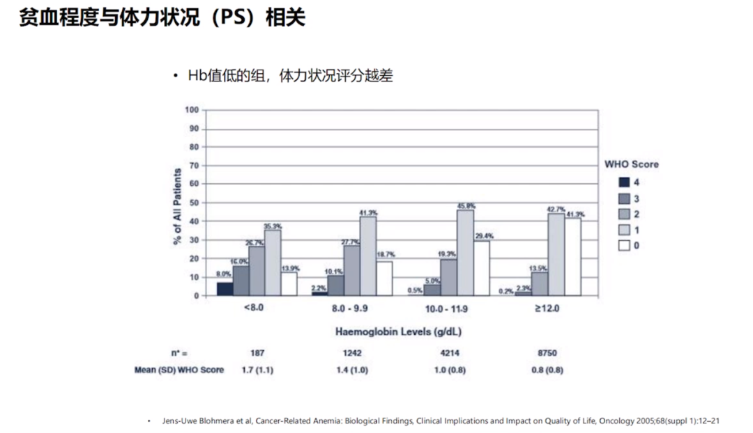 另有研究显示,患者贫血越严重,体力评分(PS)越差。患者Hb≥12g/dL时,41%的患者PS为0,仅约15%的患者PS≥2分;而当Hb<8.0g/L时,仅13.9%的患者PS=0,超过50%的患者PS≥2分,甚至8%的患者PS=4分[15]