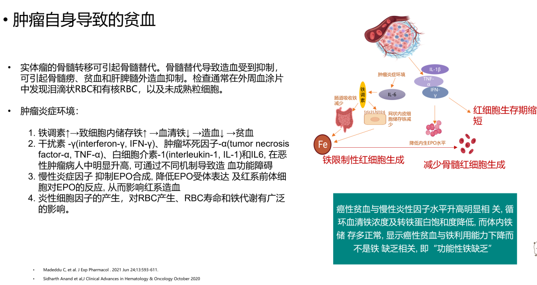 肿瘤本身可能也与贫血的发生相关。一方面,实体瘤的骨髓转移可使肿瘤细胞替代骨髓中的造血干细胞,导致造血抑制。另一方面肿瘤炎性环境使得铁调素(Hp)表达升高,癌细胞处于高铁状态,而血清中铁浓度和铁转运蛋白(Fpn)饱和度降低,引起“功能性缺铁”;肿瘤炎症环境产生的慢性炎症因子还会抑制EPO合成,影响造血功能,也会直接降低更好红细胞寿命,进一步加重贫血[16,17]