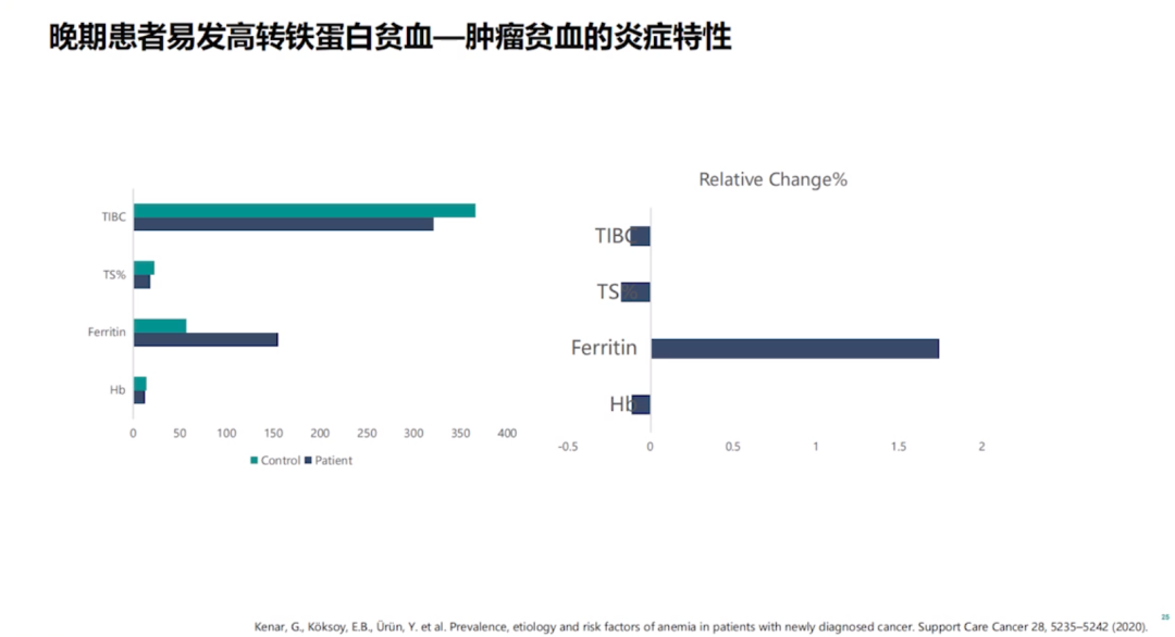 临床研究观察到晚期癌症患者的贫血严重程度较早期更重,铁缺乏(铁蛋白≤15ng/ml)发生率低,铁蛋白水平高,炎症型贫血特点更为突出。相较于健康人群,晚期癌症患者的铁蛋白水平更高,进而证实了晚期癌症患者的贫血为典型的肿瘤炎症性贫血[19]