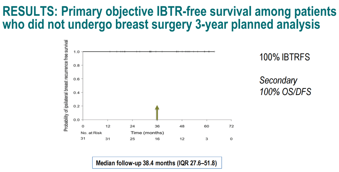 既往在可行性阶段对VACB确定的pCR患者在NST后进行单独放疗(不进行乳房手术)(Johnson et al.JACS 2023)、两年预先计划的主要结局(Kuerer et al.Lancet Onc 2022)、32.4个月患者报告结局(Johnsonet al.SSO 2023)进行了评价。本次报告3年计划的无IBTR生存率的主要研究终点,以及CTCs/ctDNA检测(基线pCR,6个月和一年放疗后)相关的初始相关次要终点。中位随访时间为38.4个月(IQR 27.6~51.8)。