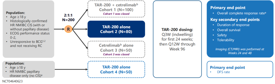Dr.Andrea Nccchi:Well,the SunRISe-1 is a part of a platform study testing TAR-200 as monotherapy or in combination with the immune checkpoint inhibitors or Cetrelimab(anti PD-1 agent)in various disease stages.The SunRISe-1 in particular is a randomized phase 2b open-label study in which patients are randomized to receive a TAR-200 in combination with the Cetrelimab in cohort-1,TAR-200 in monotherapy in cohort-2,or Cetrelimab in monotherapy in cohort-3.There is an additional cohort of patients that is included in this currently enrolling patients that is cohort-4.It is included in patients with the papillary,high-risk,non-muscle invasive disease.Importantly,cohort-1,2,and 3 are included in patients with the crinoma in situ disease,to component with or without a papillary disease who have already experienced a BCG failure and who has already received a sufficient number of BCG intravascular in order to define them as having a BCG unresponsive disease.The standard of care for experimental radical cystectomy and these patients are refusing or unfit for radical cystectomy.The reported data pertains to the monotherapy cohort,specifically Cohort 2,where TAR-200 is administered every three weeks for the initial 24 weeks and subsequently every 12 weeks until week 96.The primary endpoint is the complete response rate,rigorously assessed centrally through urine cytology and biopsies at weeks 24 and 48.It’s essential to note the stringent definition of this endpoint.