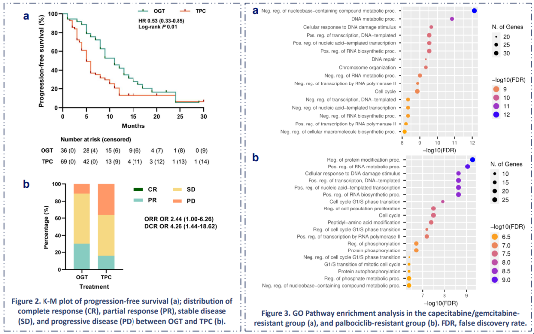 与TPC相比,OGT与MBC患者中位PFS延长相关(11.0月vs.5.0月,HR 0.53[0.33-0.85]);与更高的DCR相关(88.9%vs,63.8%,OR 4.26[1.44-18.62])。两者的ORR则无显著差异。对卡培他滨/吉西他滨相对不敏感(PDO药敏检测中细胞死亡率<50%)患者的突变基因进行通路富集分析提示,突变基因与DNA修复和转录调控通路有关。对派柏西利相对不敏感患者的突变基因则与细胞周期调控通路有关。