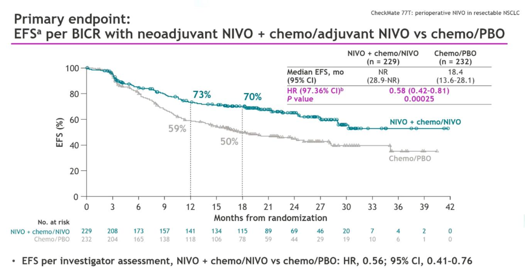 今年ESMO年会上,CheckMate-77T研究也首次公布了数据,该研究中,II-IIIa期非小细胞肺癌患者接受4周期化疗或化疗联合纳武利尤单抗新辅助治疗,4周期新辅助治疗后进行手术,术后接受纳武利尤单抗1年的维持治疗,主要研究终点为EFS。最终,两组EFS分别为18.4个月和未达到,HR=0.58,P=0.00025。基线分期为II期的患者,两组中位EFS均为未达到,HR=0.81,而基线分期为III期的患者,两组中位EFS分别为13.4个月和30.2个月,HR=0.51,不同PD-L1表达水平的患者都可以从这一治疗中获益,PD-L1<1%的患者,两组中位EFS分别为19.8个月和29.0个月,PD-L1≥1%的患者,两组中位EFS分别为15.8个月和未达到,HR=0.52。进一步按照术后是否接受辅助治疗进行区分,接受术后辅助治疗的患者,两组中位EFS分别为35.1个月和未达到,HR=0.45,未接受术后辅助治疗的患者,两组中位EFS分别为5.2个月和8.8个月,HR=0.55。