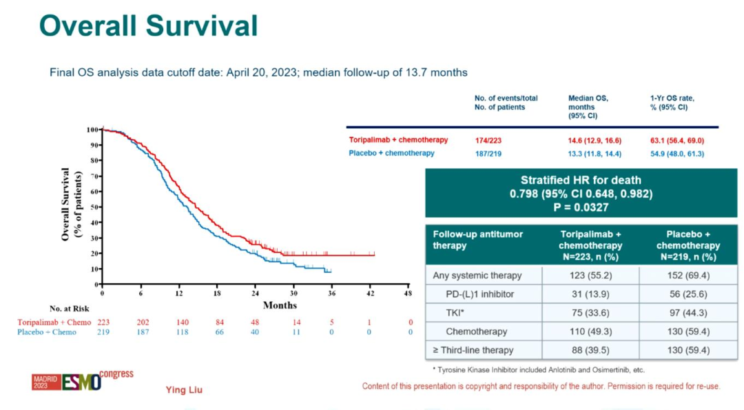 今年ESMO年会则公布了特瑞普利单抗联合含铂双药化疗一线治疗广泛期小细胞肺癌的疗效及安全性。该研究设计与同类药物的研究设计相似,纳入初治广泛期小细胞肺癌患者,按1:1比例随机分为含铂双药治疗或在此基础上联合特瑞普利单抗,主要研究终点为PFS和OS。最终,两组中位PFS分别为5.6个月和5.8个月,HR=0.667,P=0.00002;两组中位OS分别为13.3个月和14.6个月,HR=0.798,P=0.0327,3度及以上全因不良反应发生率分别为89.6%和89.4%。