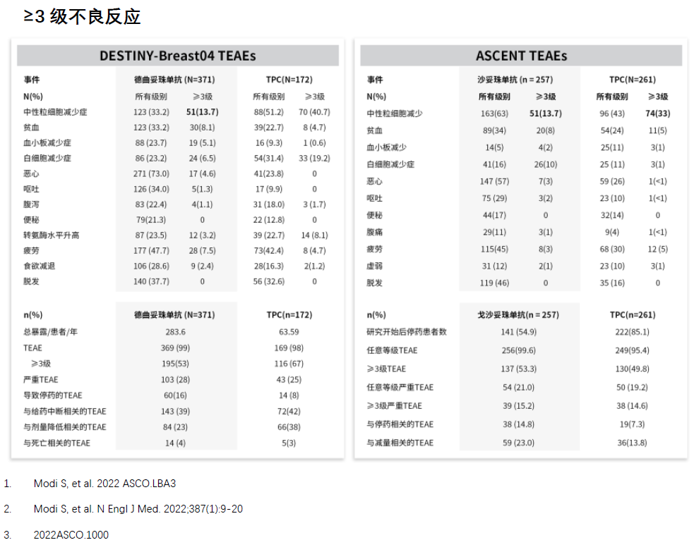 在安全性方面,DESTINY-Breast04研究[10]与ASCENT研究中[18]的总体表现如下表所示(非头对头比较)。T-DXd的主要不良事件为中性粒细胞减少、贫血、疲劳等,且需要特别关注间质性肺病(ILD)的发生。SG则以血液学毒性、腹泻为主要表现,临床处理经验丰富,易管理。