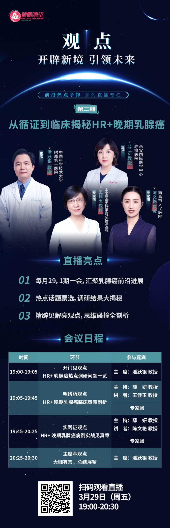 2024年3月29日晚19:00,《观点》第二期隆重启幕。中国科学技术大学附属第一医院潘跃银教授倾情领衔,西安国际医学中心肿瘤医院薛妍教授主持,中国医学科学院肿瘤医院王佳玉教授、南昌市人民医院陈文艳教授共同就“从循证探索到临床实践揭秘HR+晚期乳腺癌”深入讨论,从试验数据解读到临床病例诊疗实战碰撞观点,寻求更优诊疗策略。