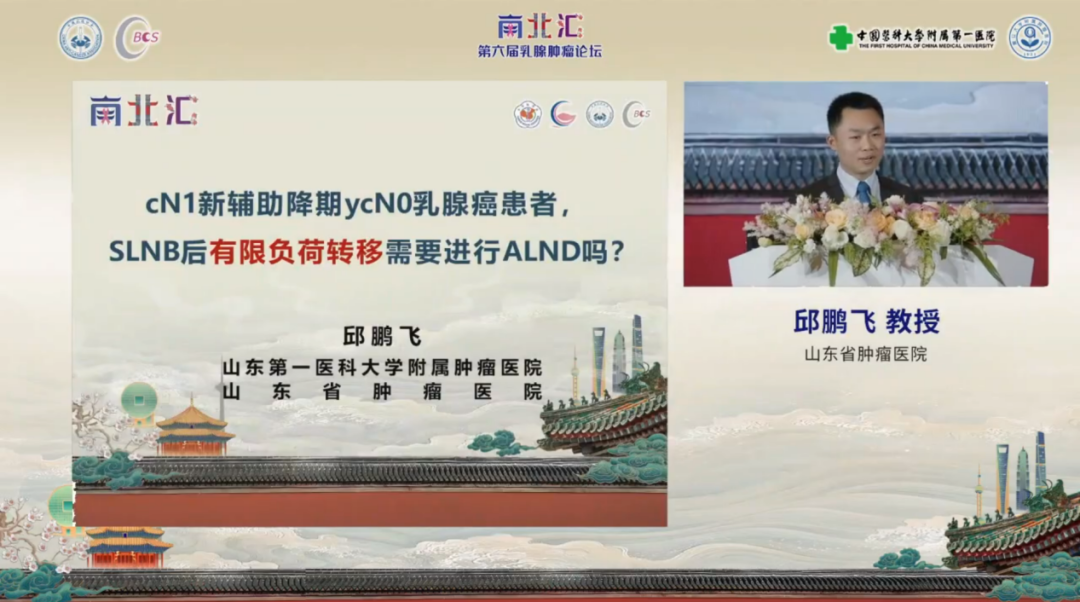 编者按:新辅助治疗后的腋窝淋巴结负荷与预后密切相关,与初始手术患者的评估不同,新辅助治疗后的肿瘤细胞残留被认为是耐药细胞的残留,那么新辅助后SLNB有限负荷转移是否能够豁免ALND呢?在2024年南北汇上,山东省肿瘤医院邱鹏飞教授带来了《cN1新辅助降期ycN0乳腺癌患者,SLNB后有限负荷转移需要进行ALND吗?》的报告,本文特对讲课内容进行回顾。
