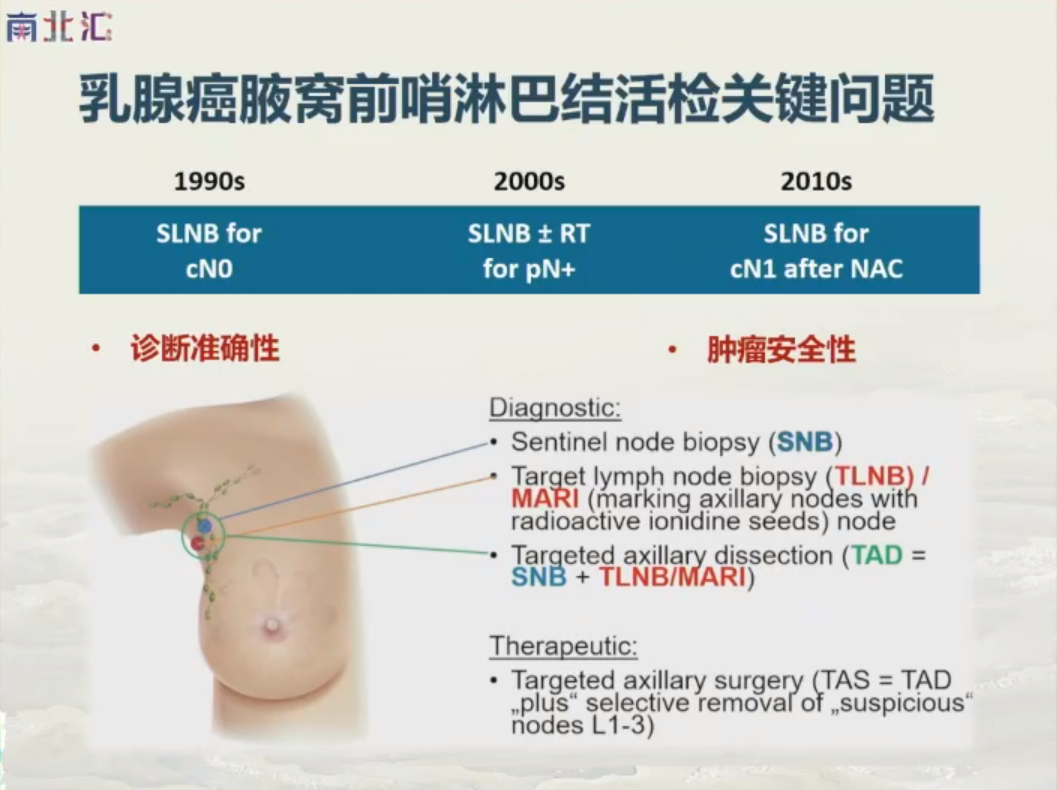 邱鹏飞教授介绍到,随着前哨淋巴结活检(SLNB)循证医学证据的不断积累,越来越多的患者实现了外科手术的降阶梯。但无论处在前哨淋巴结(SLN)的哪个时代,始终围绕着两个问题。一是诊断准确性。这对于新辅助治疗之后的SLN诊断也提出了更多的要求,诊断的准确性会在很大程度上影响后续腋窝残余肿瘤负荷。二是肿瘤安全性。新辅助后SLNB在技术上已经比较成熟了,也积累了一些关于复发风险的证据,但仍存在一些问题,如随访时间不足等。因此,目前CBCS指南对于新辅助降期之后的SLNB还是持有比较谨慎的态度。