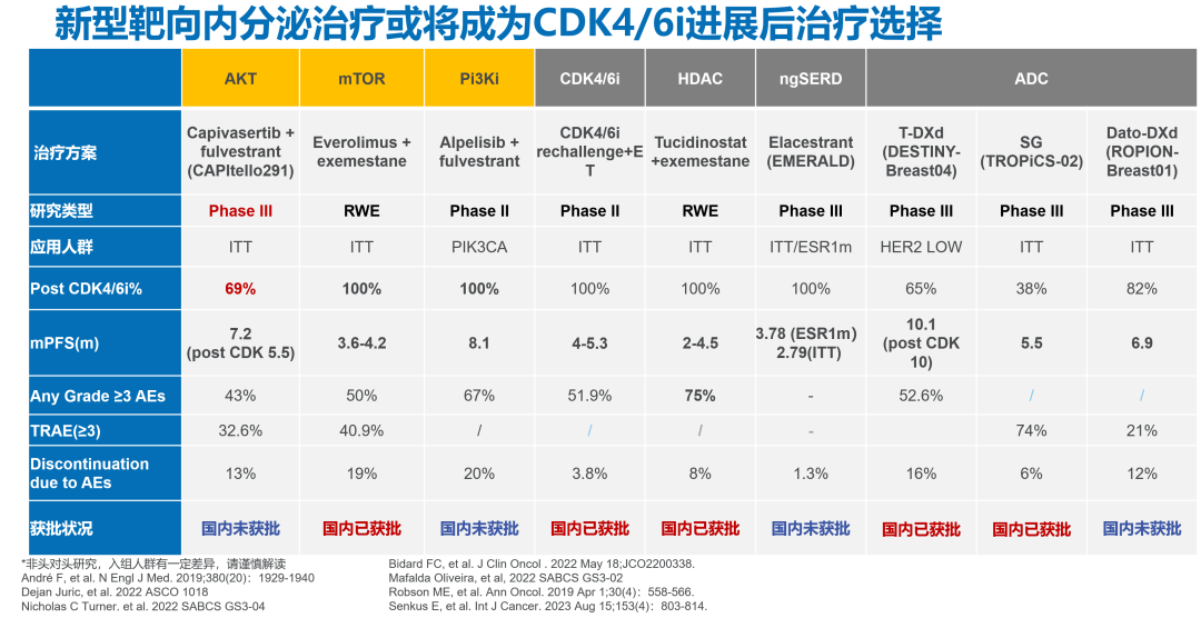 该研究显示,Capivasertib联合氟维司群在总人群和AKT通路异常人群中,均较氟维司群单药有显著的mPFS改善。因此,《中国抗癌协会乳腺癌诊治指南与规范(2024简要版)》及《NCCN乳腺癌临床实践指南2024v2》均推荐AKT抑制剂Capivasertib联合氟维司群作为CDK4/6i经治后的标准治疗方案。而其他新型内分泌药物Ⅲ期临床研究仍在继续,值得期待。