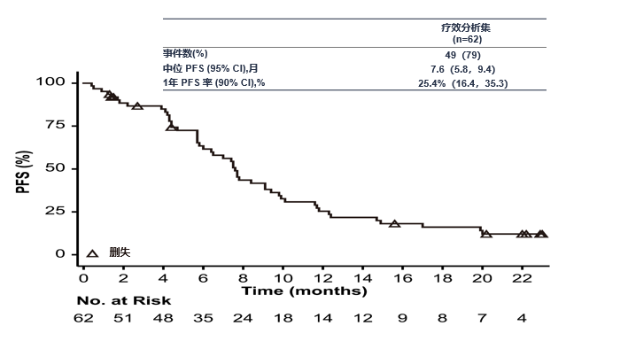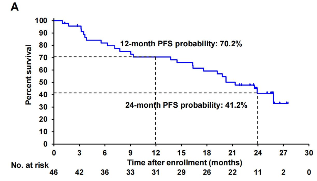 队列2为免疫联合贝伐珠单抗及白蛋白紫杉醇诱导治疗,随后给予免疫联合贝伐珠单抗维持治疗。患者1年PFS率为46.1%,其90%CI:32.5~58.7下限高于历史对照化疗数据的7%,达到主要研究终点;患者中位PFS为10.9个月,同样展示了良好的疗效。