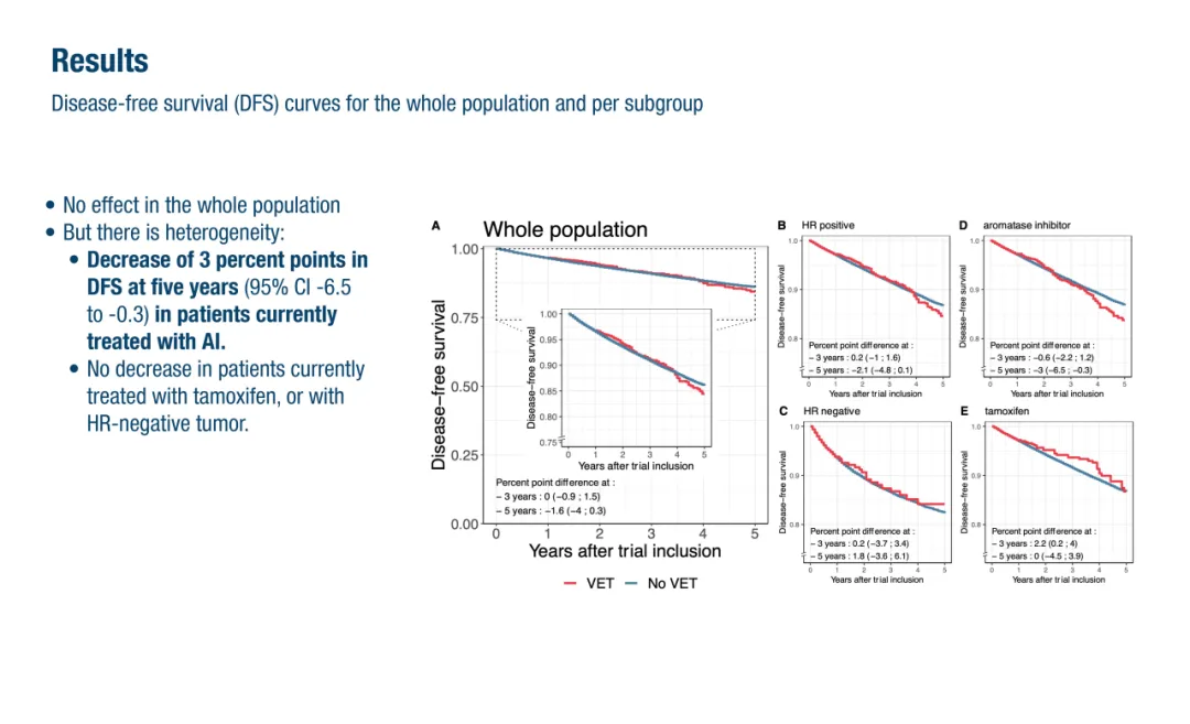 图2.VET对HR阳性乳腺癌患者和接受芳香化酶抑制剂治疗的患者的无病生存期有不利影响(2024 ESMO BC,Abstract 268MO)