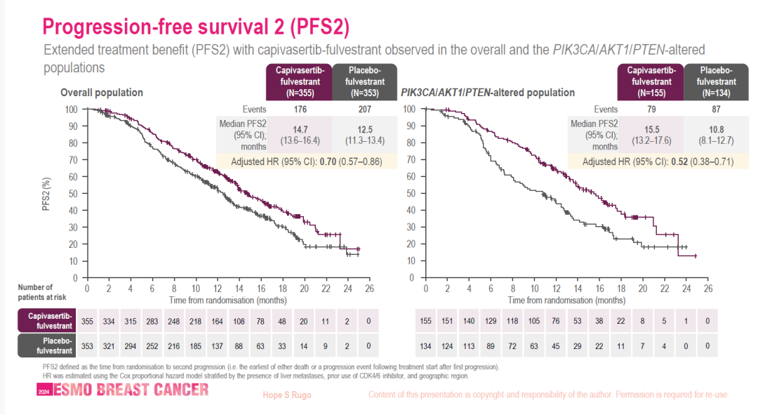 本次ESMO BC主要公布了该研究PFS2数据(从随机到第二次进展的时间)以及TFSC(从随机到首次开始后续化疗的时间,或从随机到首次开始后续化疗前任何原因导致死亡的时间)数据。经过PIK3CA/AKT1/PTEN筛选后,最终纳入此次分析卡匹色替联合氟维司群组患者155例,安慰剂+氟维司群组134例。结果显示,卡匹色替联合氟维司群组较安慰剂联合氟维司群组可延长全人群mPFS2,为14.7个月vs 12.5个月,mTFSC为11.0个月vs 6.8个月;其中PIK3CA/AKT1/PTEN筛选组mPFS2为15.5个月vs 10.8个月,mTFSC为11.0个月vs 6.0个月。