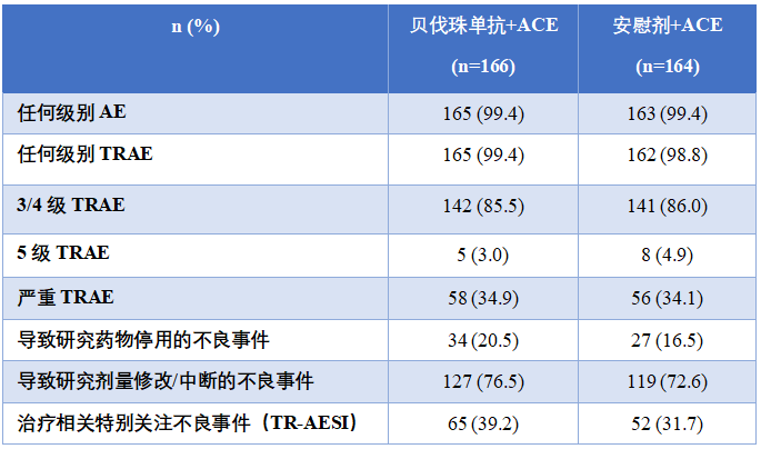 研究人员报告称,在330名患者的安全性分析人群中,贝伐珠单抗+ACE“耐受性良好”,并指出“未观察到新的安全信号”,治疗相关不良事件“在治疗组之间大致相似”。