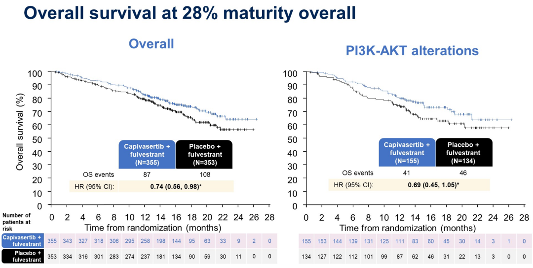 陈益定教授:尽管PFS是许多新药注册临床试验的主要终点,但OS仍是临床医生心目中检验新药的“金标准”。CAPItello-291研究的OS尚未成熟(成熟度仅为28%),但已展现获益趋势,总人群和AKT改变人群的OS HR分别为0.74和0.69[2]。