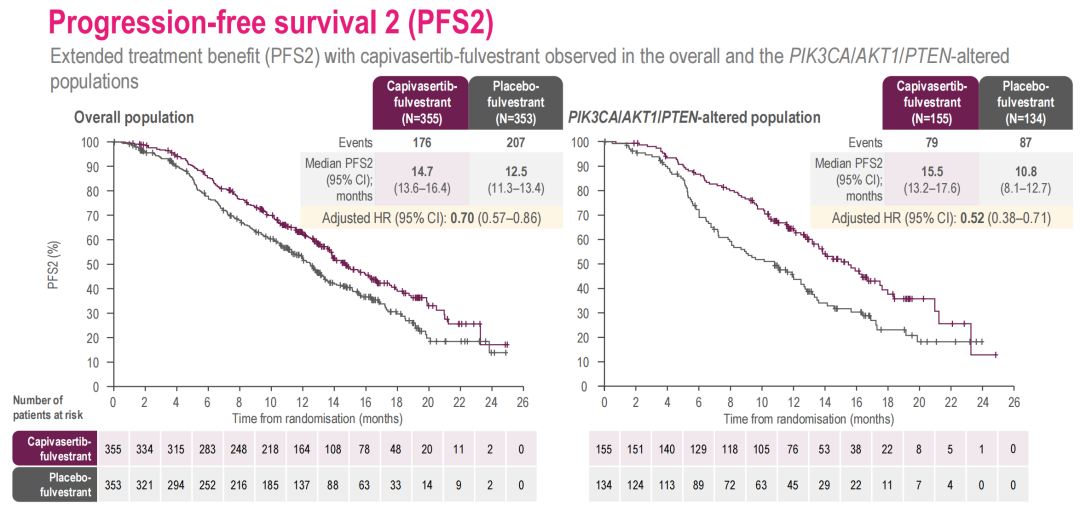 近期举行ESMO-BC大会报道了该研究的更长随访数据[3],卡匹色替可以延长第二次无进展生存期(PFS2):在总人群中,卡匹色替组相较于对照组的PFS2风险比(HR)为0.70;AKT变异人群的风险比则为0.52;此外,卡匹色替还可有效延迟患者首次接受化疗的时间(TFSC,HR 0.56)。这些更长随访的PFS2和TFSC改善,意味着很有可能转化为OS阳性结果,期盼卡匹色替能够进一步为HR+/HER2-晚期乳腺癌经治患者带来显著的OS延长。