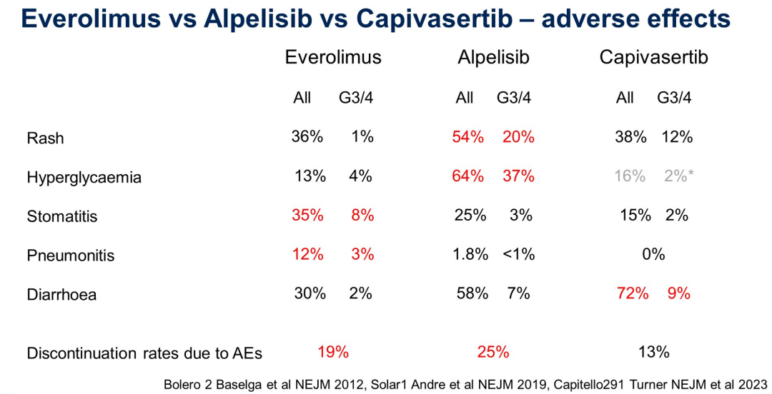 另外,从安全性考虑:依维莫司临床试验中的停药率高达19%;口腔炎、肺炎是临床较为关注的不良事件,3/4级不良事件(AE)发生率分别为8%和3%[5],此类AE的临床处理相对复杂一些。Alpelisib临床试验中的停药率也高达25%;皮疹、高血糖是较为关注的AE,3/4级AE发生率分别为20%和37%[4],尤其是高血糖的临床处理需要内分泌科等多学科参与;卡匹色替临床试验中的停药率仅为13%,腹泻是较为关注的AE,3/4级AE发生率为9%[2],不过临床对腹泻的处理经验较为丰富。