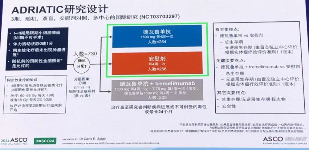 数十年来局限期小细胞肺癌的系统治疗无重大进展,目前标准同步放化疗方案的中位总生存期(OS)约为25-30个月。ADRIATIC研究旨在评价德瓦鲁单抗(PD-L1抗体)±tremelimumab(CTLA-4抗体)作为局限期小细胞肺癌同步放化疗后无进展患者的巩固治疗。2024 ASCO报道了首次期中分析结果。