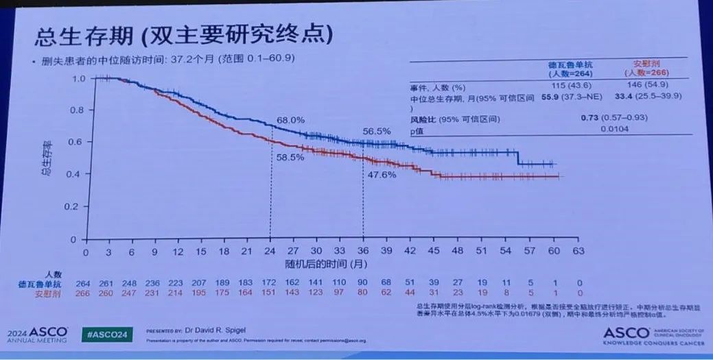 德瓦鲁单抗组和安慰剂组的中位OS分别为55.9(95%CI:37.3-NE)和33.4(95%CI:25.5-39.9)个月,OS优势近2年(HR=0.73;P=0.0104);3年OS率分别为56.5%和47.6%。