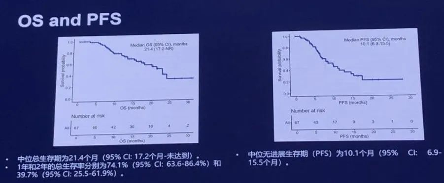 中位总生存期为21.4个月(95%CI:17.2-未达到),1年和2年的OS率分别为74.1%(95%CI:63.6-86.4%)和39.7%(95%CI:25.5-61.9%)。