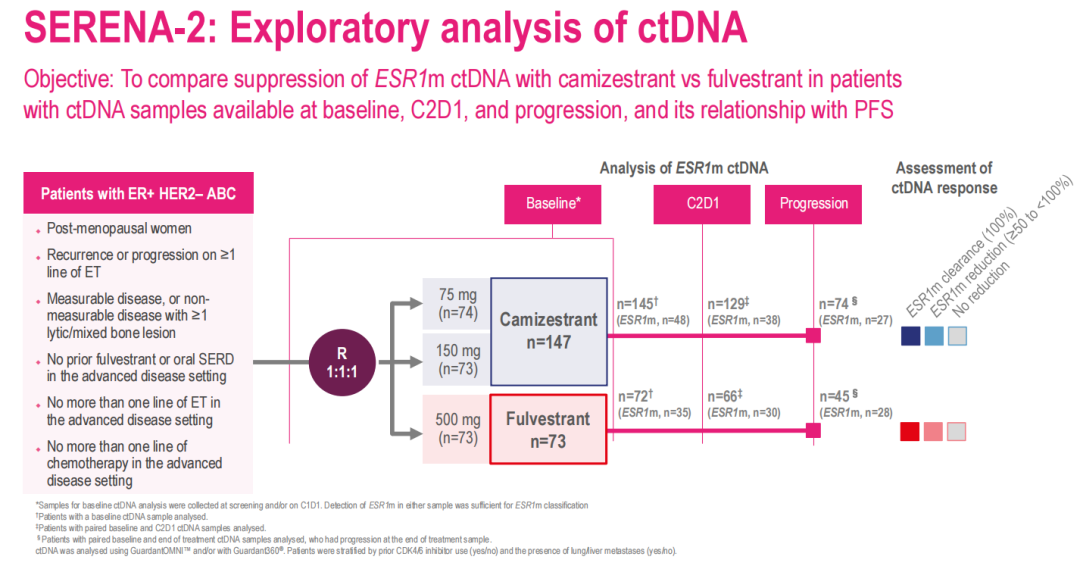 将Camizestrant 75 mg和150 mg组进行合并(N=147),并与氟维司群500 mg组(N=73)进行比较。通过对基线、第2周期第1天(C2D1)和疾病进展时收集的血浆样本进行二代测序,分析ctDNA。