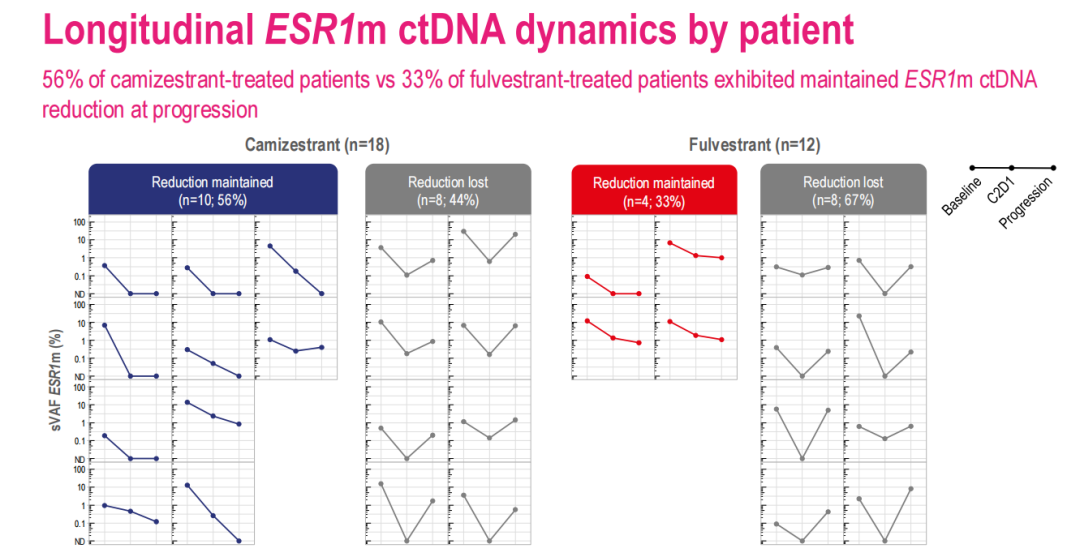 在56%camizestrant治疗的患者和33%氟维司群治疗的患者中,ESR1m在疾病进展中仍然被抑制(VAF与C2D1增加<100%)。